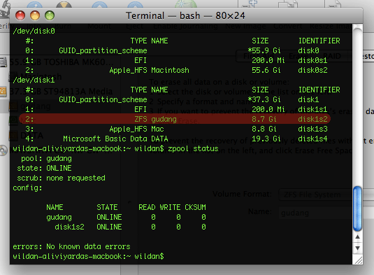 ADC announced its release of ZFS on Mac OS X few day ago. As we know, Leopard arrived with zfs read only support (few month ago, the rumor is ZFS to replace HFS+) . But, with this developer seed you can create pool and read/write your zfs partition. To create pool, you must have two physically device, not two file systems. My Assumption, you can make backup partition (Time Machine ?) with ZFS Pool on Macbook using two USB ports and two Eksternal HDD. This is still developer version, so don’t use your ZFS partition to backup your data.