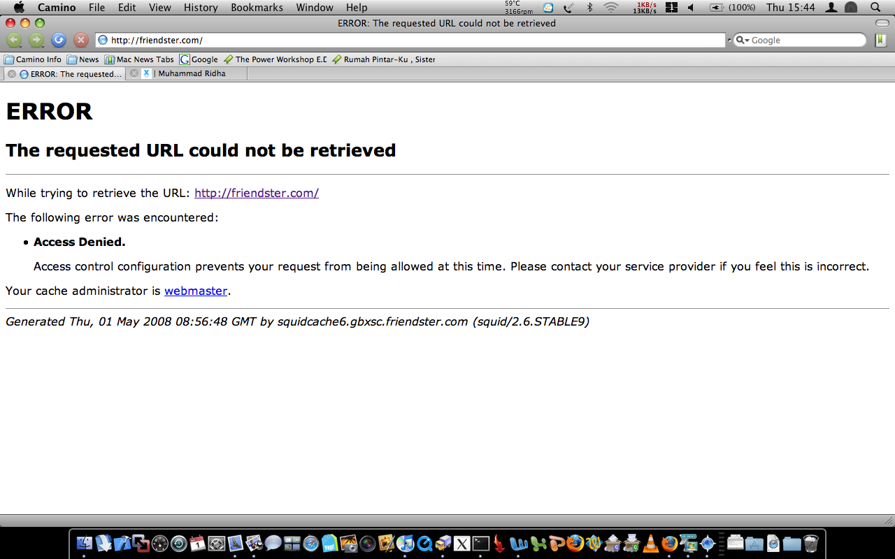 Saya mengira error disebabkan proxy yang saya gunakan. Saya refresh Friendster berkali-kali, saya cek di access.log, tidak ada yang salah. Pesan tersebut tidak hanya berasal dari squidcache6.gbxsc.friendster.com, tetapi juga squidcache8.gbxsc.friendster.com, atau mungkin dari proxy friendster yang lain. Selang beberapa menit kemudian, barulah muncul halaman maintenance Friendster.
